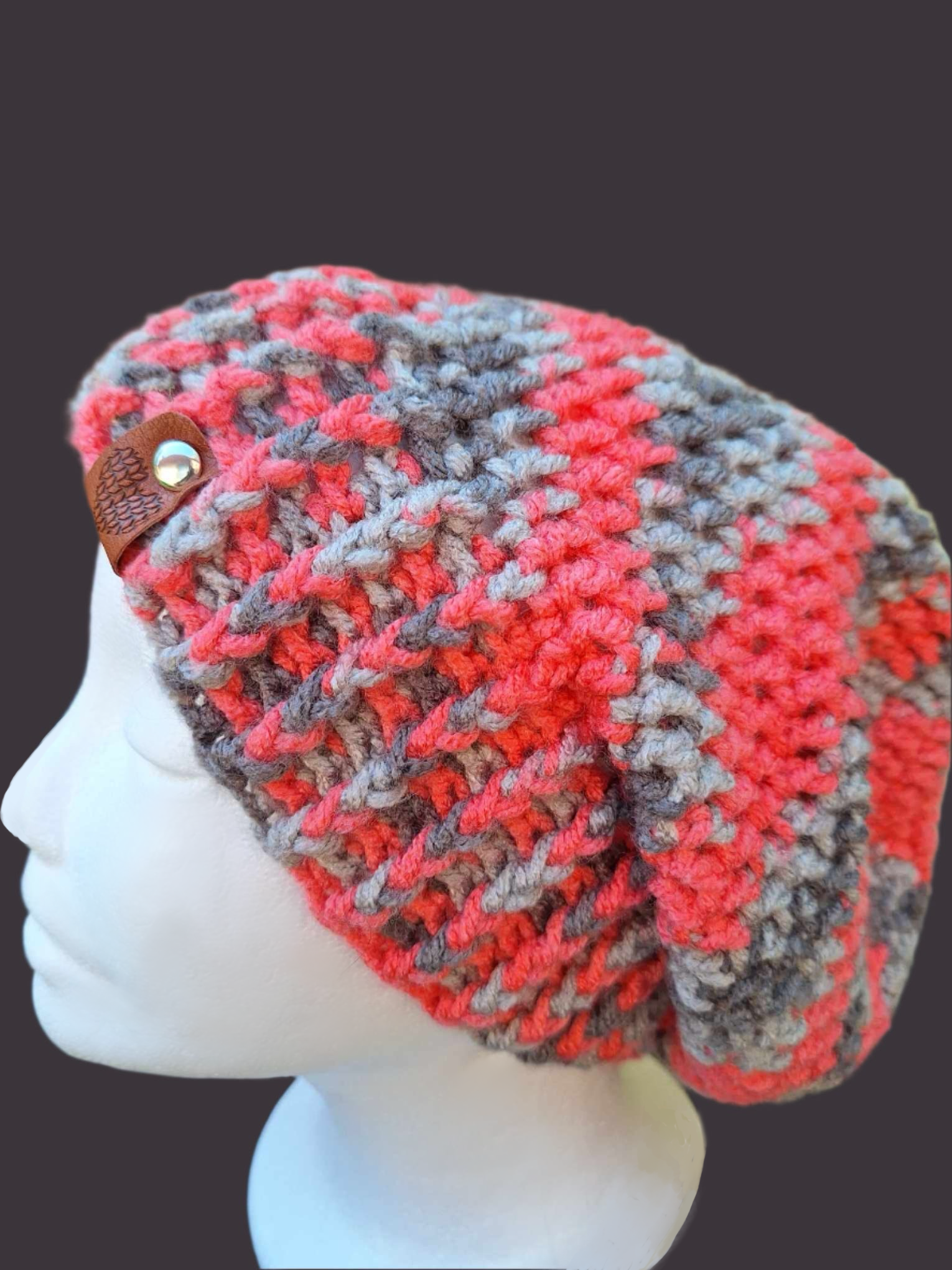 Dive into the dynamic colorplay of variegated acrylic yarn, shifting from vibrant rose-pink to soft dove-gray. Crocheted in a richly textured stitch, “Pink Cobalion” sports a generous, drapey crown and a wide fold-up cuff that lets you customize the fit. A rustic faux-leather snap tab adds a handcrafted accent—perfect for elevating both streetwear and cozy weekend vibes.