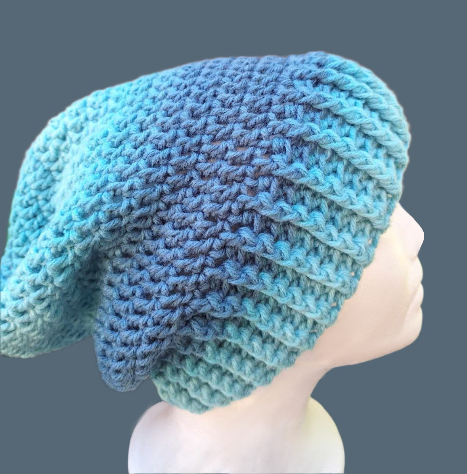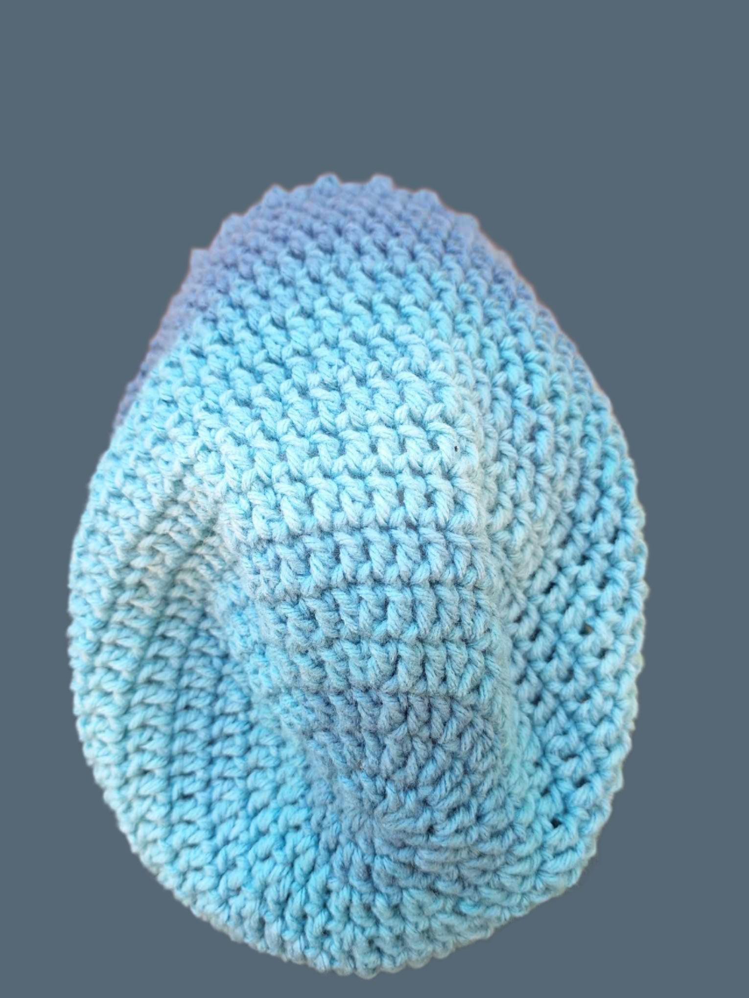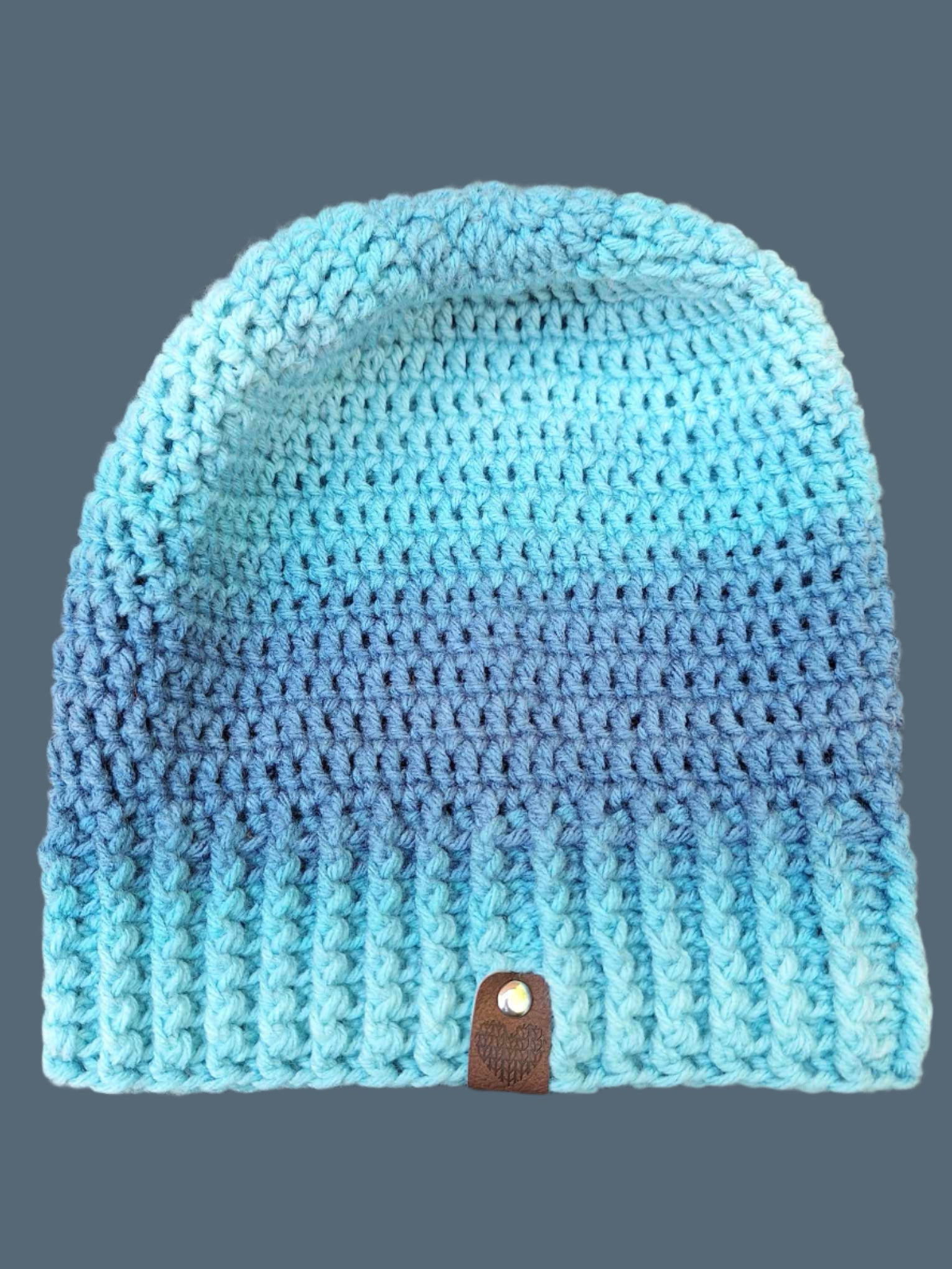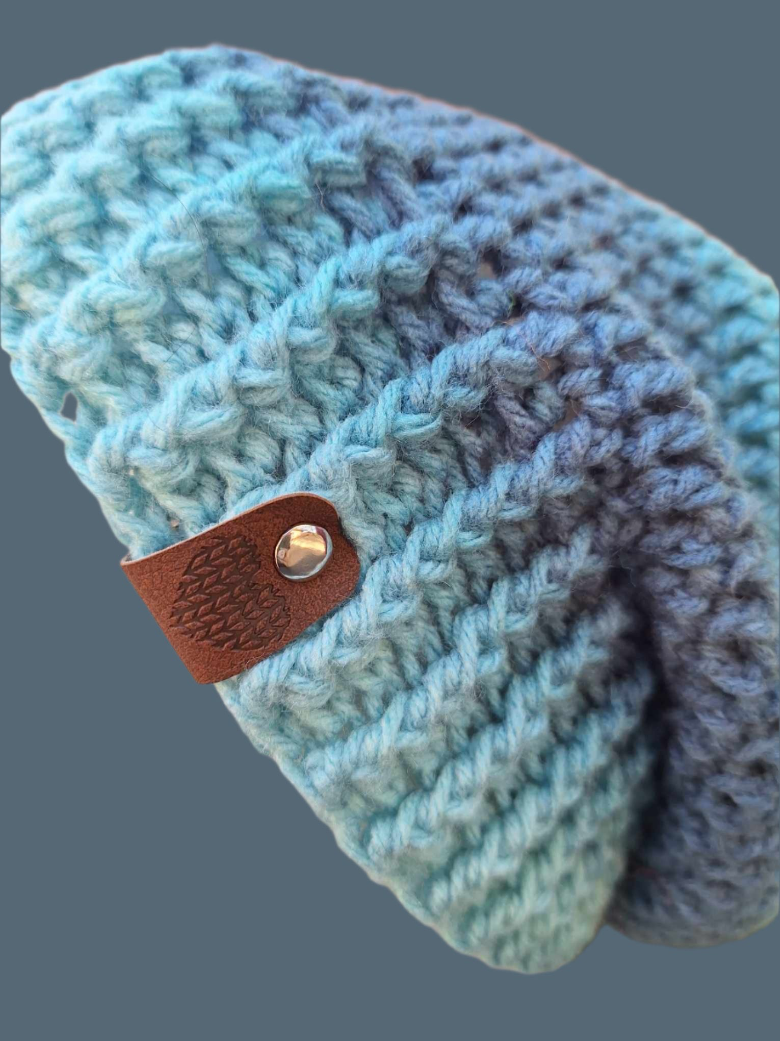Crocheted from 100% acrylic gradient yarn that drifts from soft lavender at the cuff through sky-blue midtones into a minty crown, Celestine captures the serene hues of its crystal namesake. The relaxed, drapey silhouette tucks back into effortless slouch, while the wide fold-up ribbed brim lets you choose between a cozy ear-covering fit or a stylish stacked cuff. A coordinating faux-leather snap tab embossed with a heart adds a handcrafted flourish.