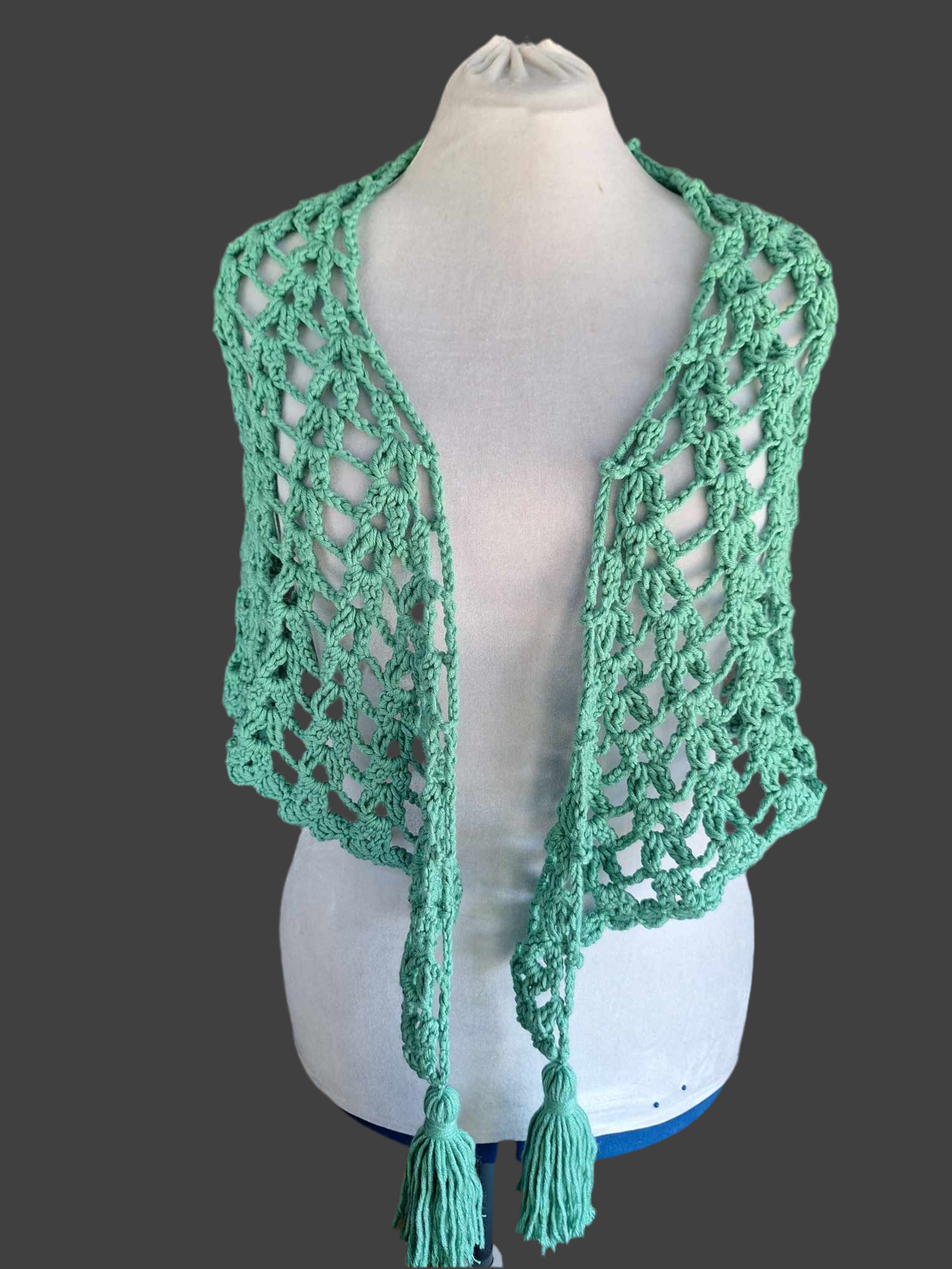 Crocheted with a luxurious blend of acrylic, nylon, and wool, Turquoise gleams in a rich mineral green-blue hue that evokes the raw beauty of its namesake stone. The airy latticework pattern is balanced by weighty tassels that ground the piece in drama and elegance. A stunning accessory for layering or styling as a statement piece.