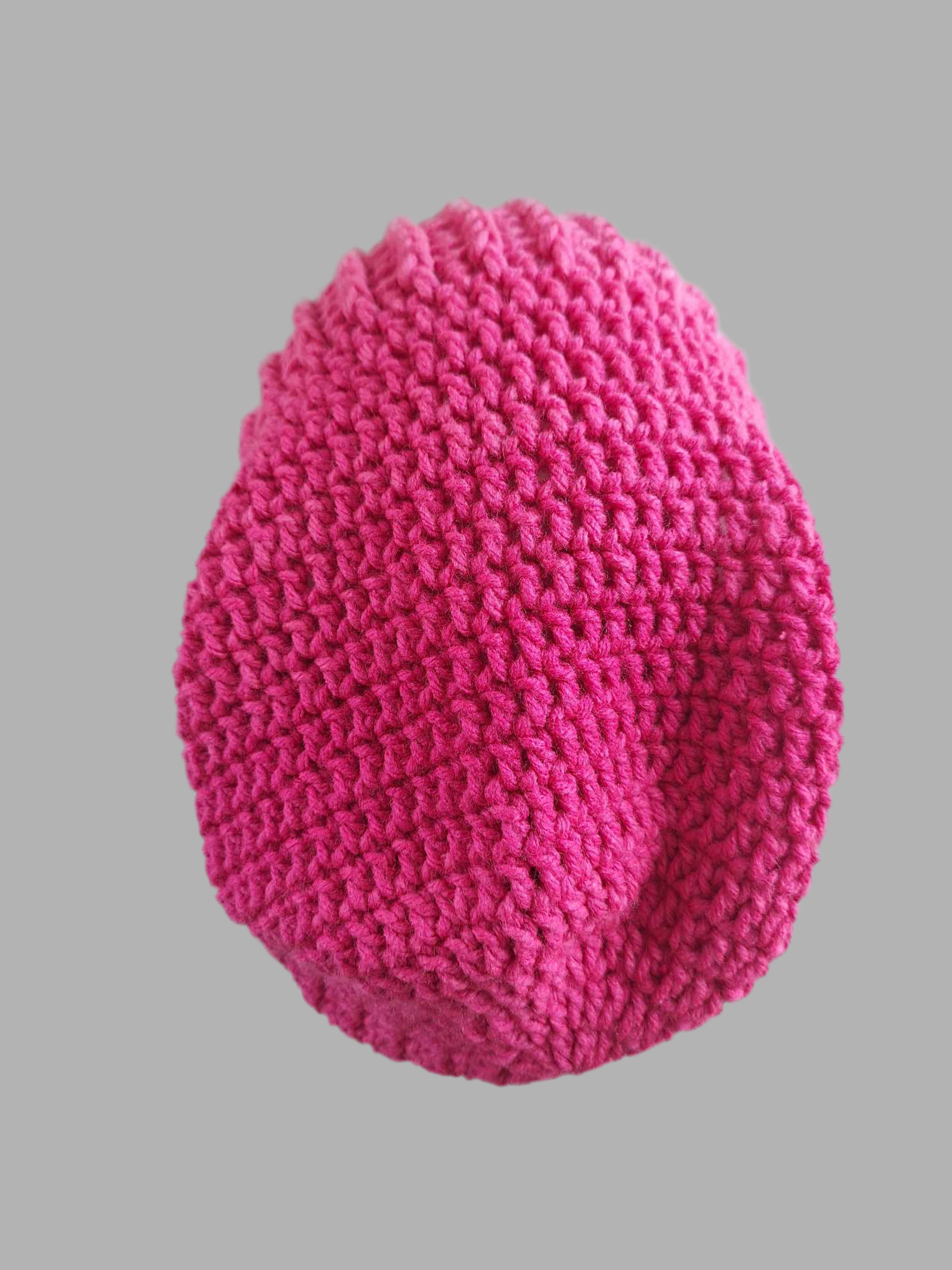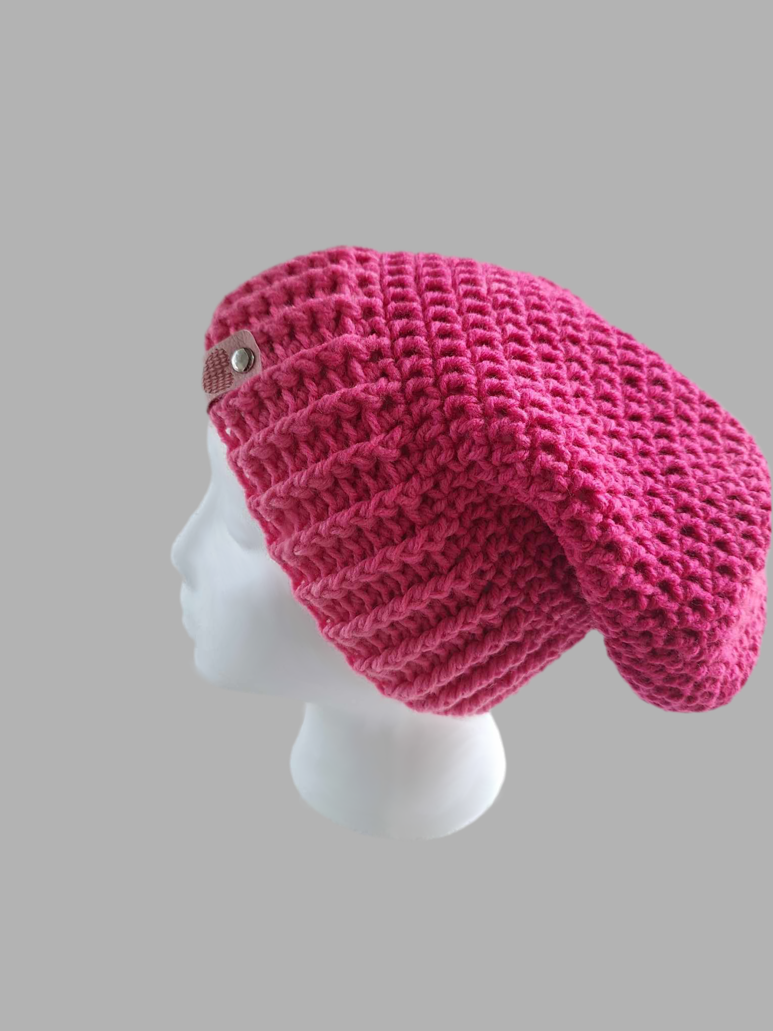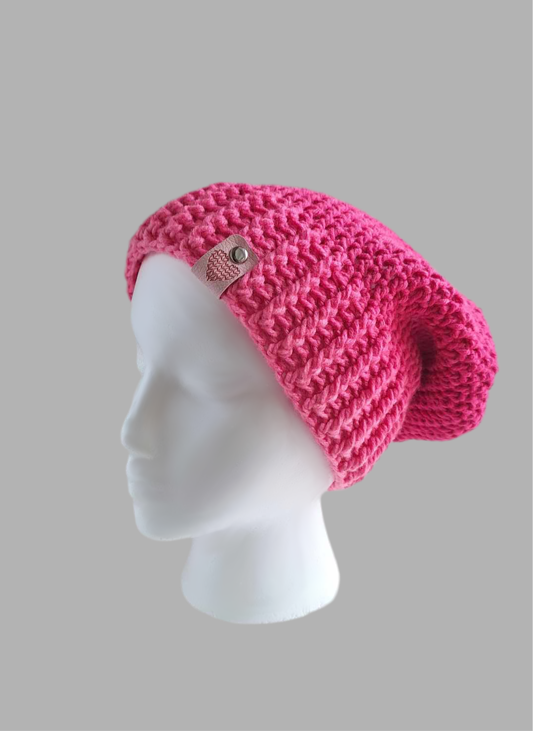Crocheted from 100% acrylic yarn in a saturated bubble-gum pink, “Pink Spinel” features a textured diagonal-rib stitch that adds depth and plush warmth. The roomy slouch crown drapes effortlessly at the back, while a wide, fold-up ribbed brim lets you dial in the perfect fit. Finished with a faux-leather snap tab embossed with a heart, this beanie brings an artisan touch to any cold-weather ensemble.