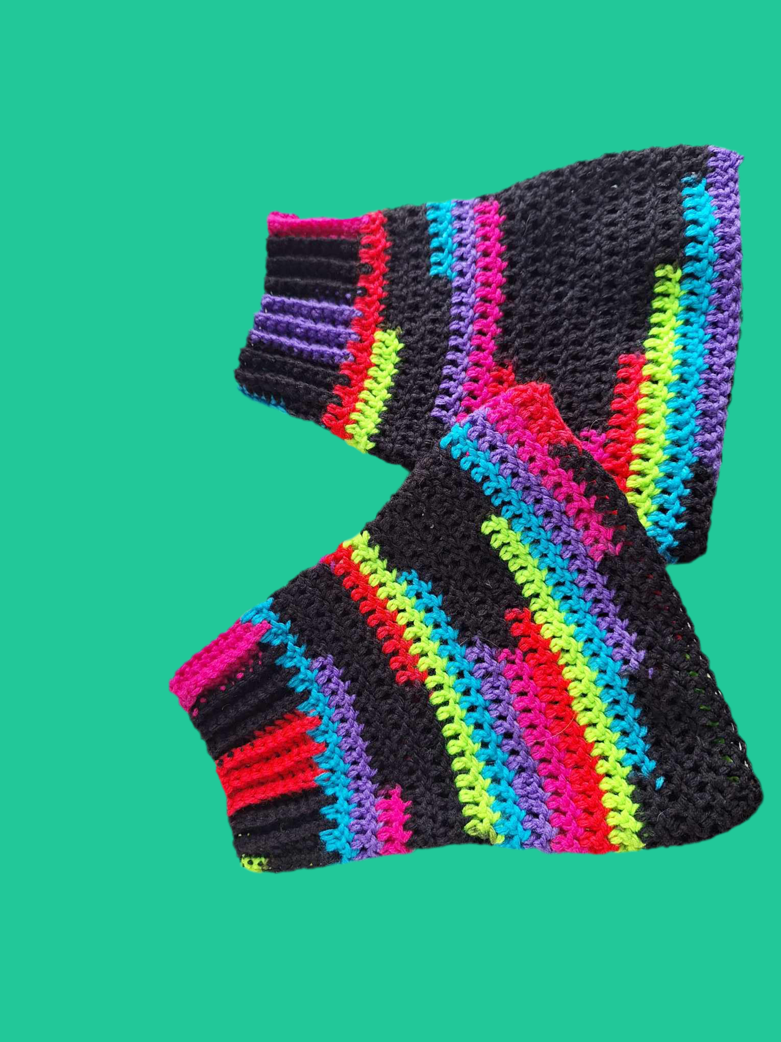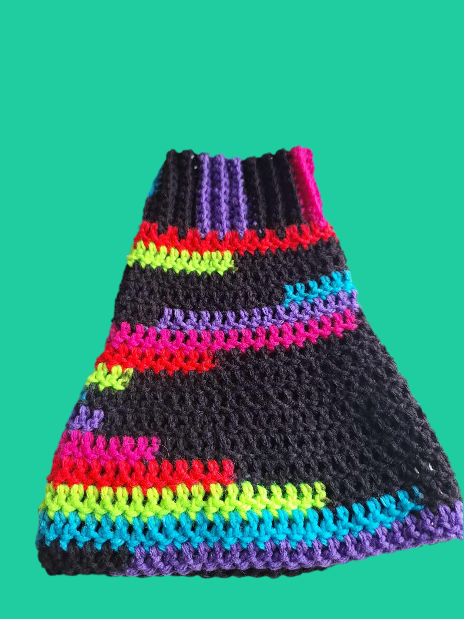 Hand-crocheted from 100% acrylic yarn, these vibrant leg warmers feature streaks of neon pink, violet, acid green, cobalt blue, and red against a deep black base—like gemstone veins glowing in volcanic stone. A ribbed top cuff ensures a snug yet flexible fit, while the flared body drapes effortlessly over boots, leggings, or bare legs.