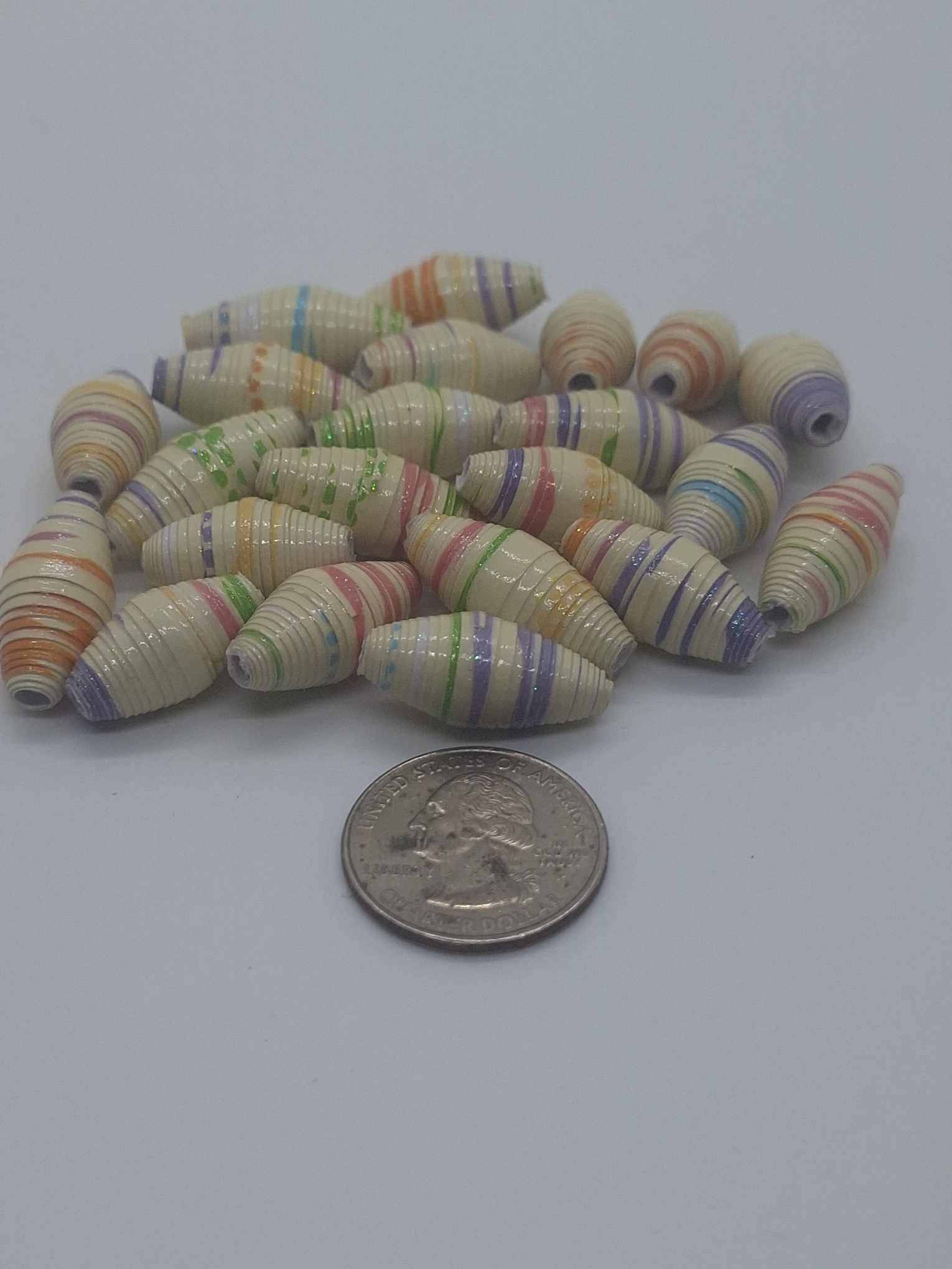 Each resealable bag contains 22 hand-rolled, glazed paper barrel beads, each approximately the size of a quarter (about 24 mm long). Crafted from paper and sealed with a durable, glazed in clear glossy polycrylic, these beads bring a splash of color and lightweight texture to your jewelry and craft projects.