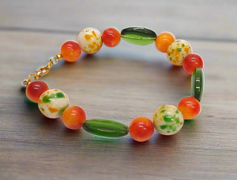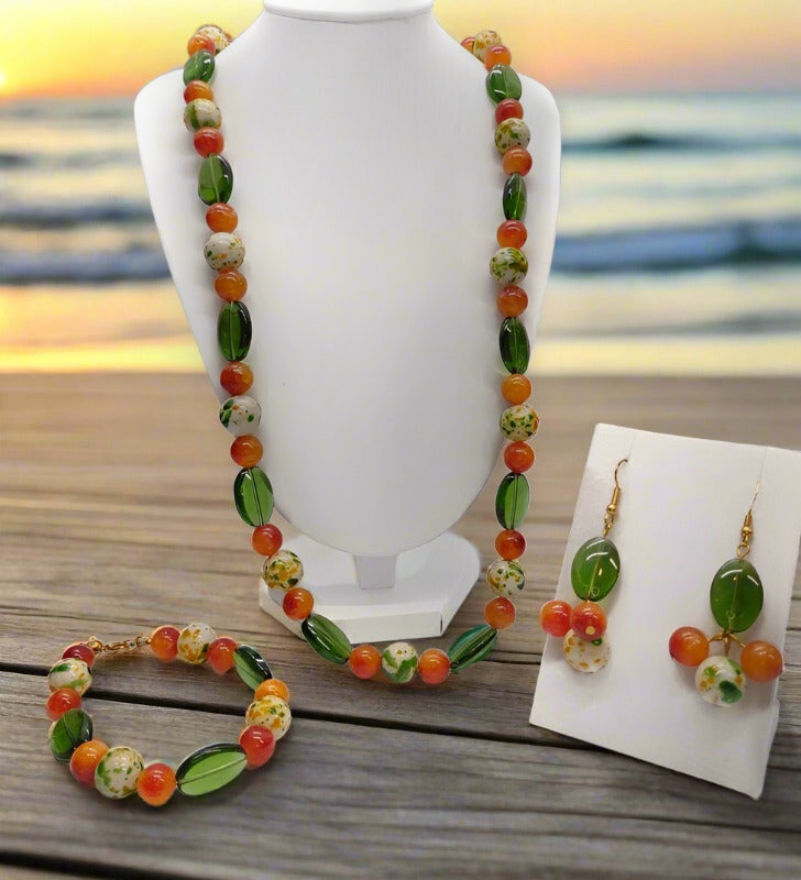 Channel the warmth of a summer sunset with our Harvey’s Beach collection—a radiant trio of necklace, bracelet, and earrings artfully combining verdant greens, warm corals, and speckled ivory.