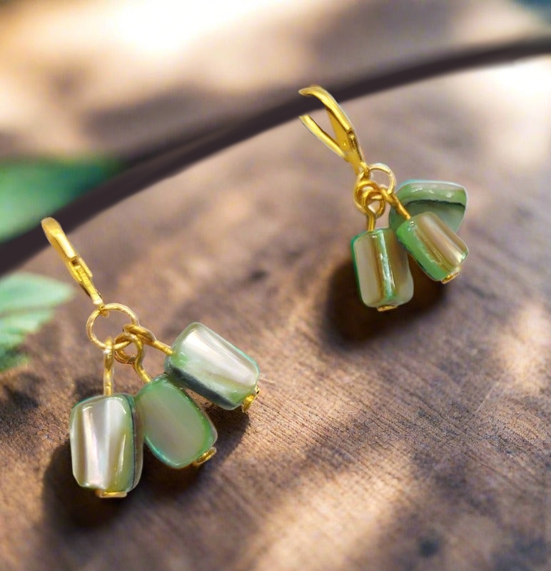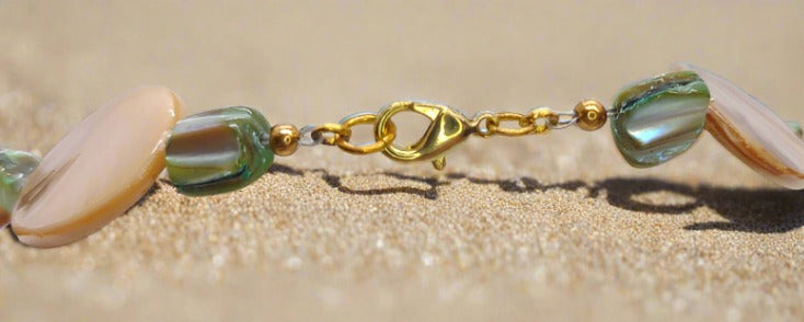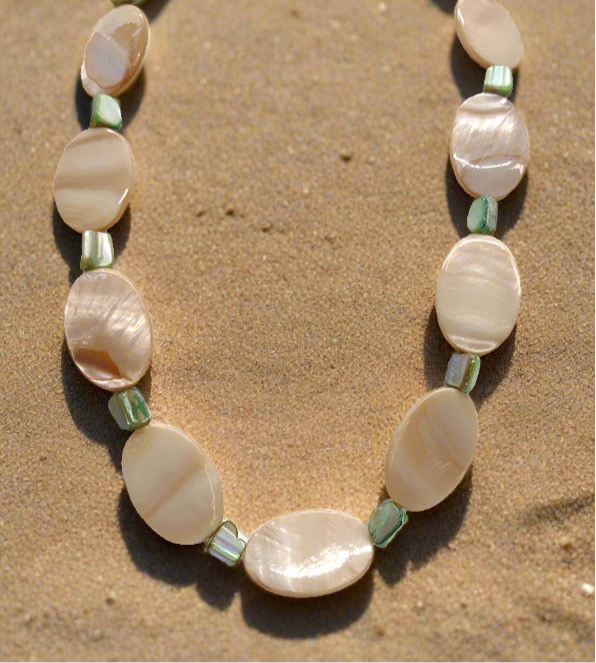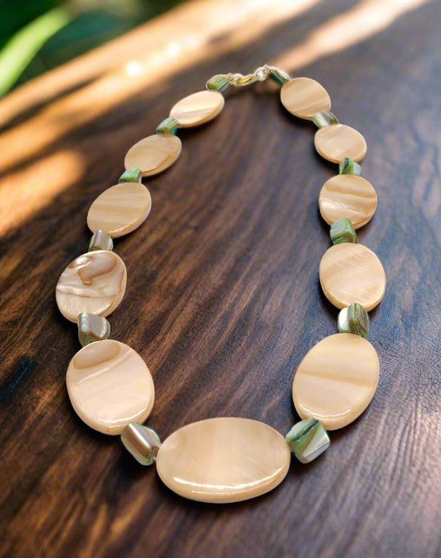 This meticulously handcrafted set consists of three pieces made with exquisite cream colored shell beads and stunning green shell beads. The necklace, a magnificent 18 inches in length is adorned with a lustrous gold tone lobster claw clasp. Additionally. The bracelet. Measuring 7 inches long. Features the same elegant gold tone lobster claw clasp. Completing the ensemble are the earrings. Gracefully hanging half an inch from gold tone leaver backs.